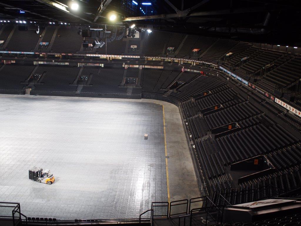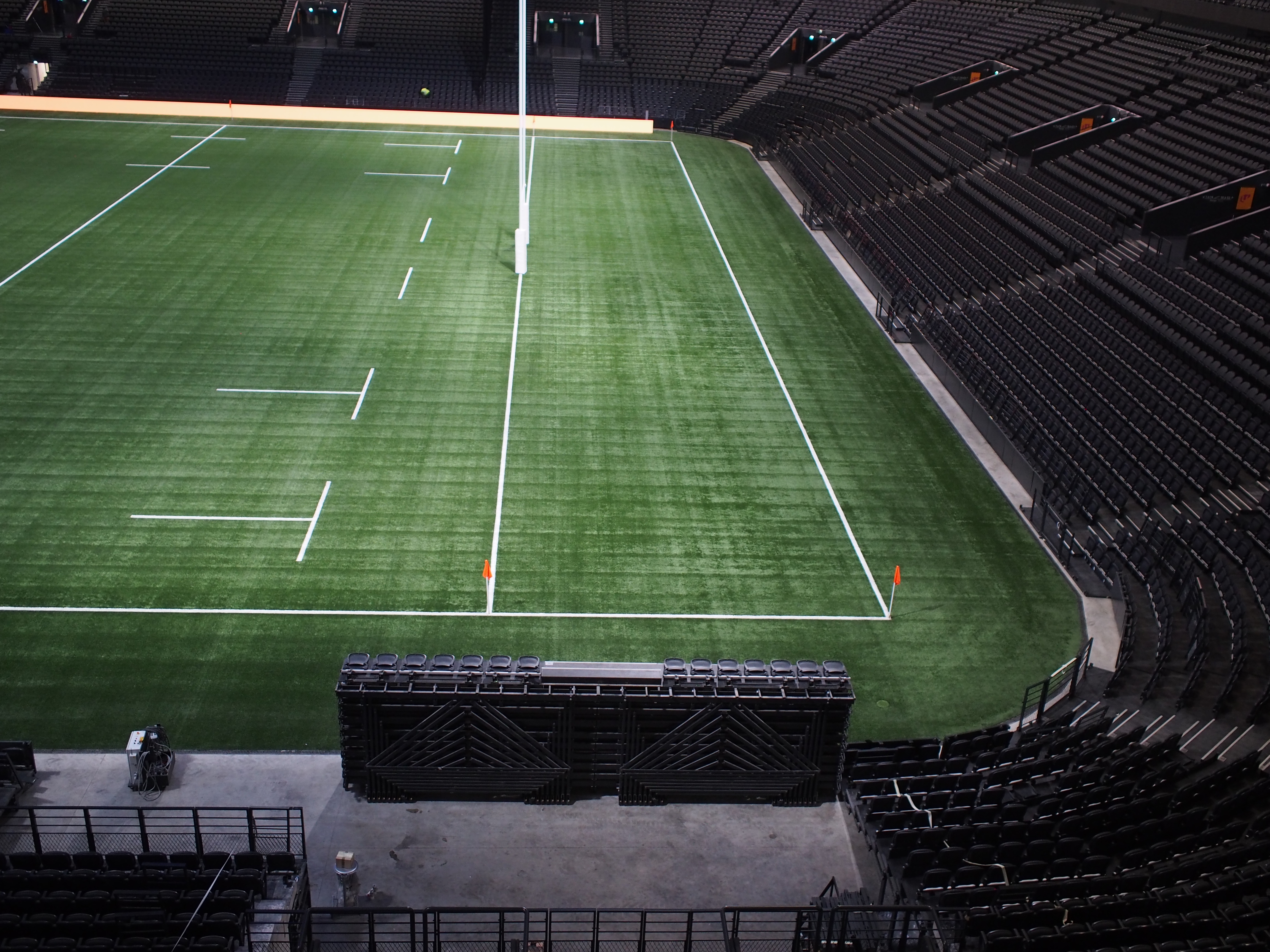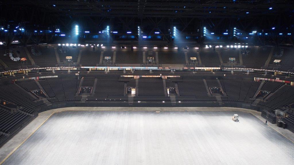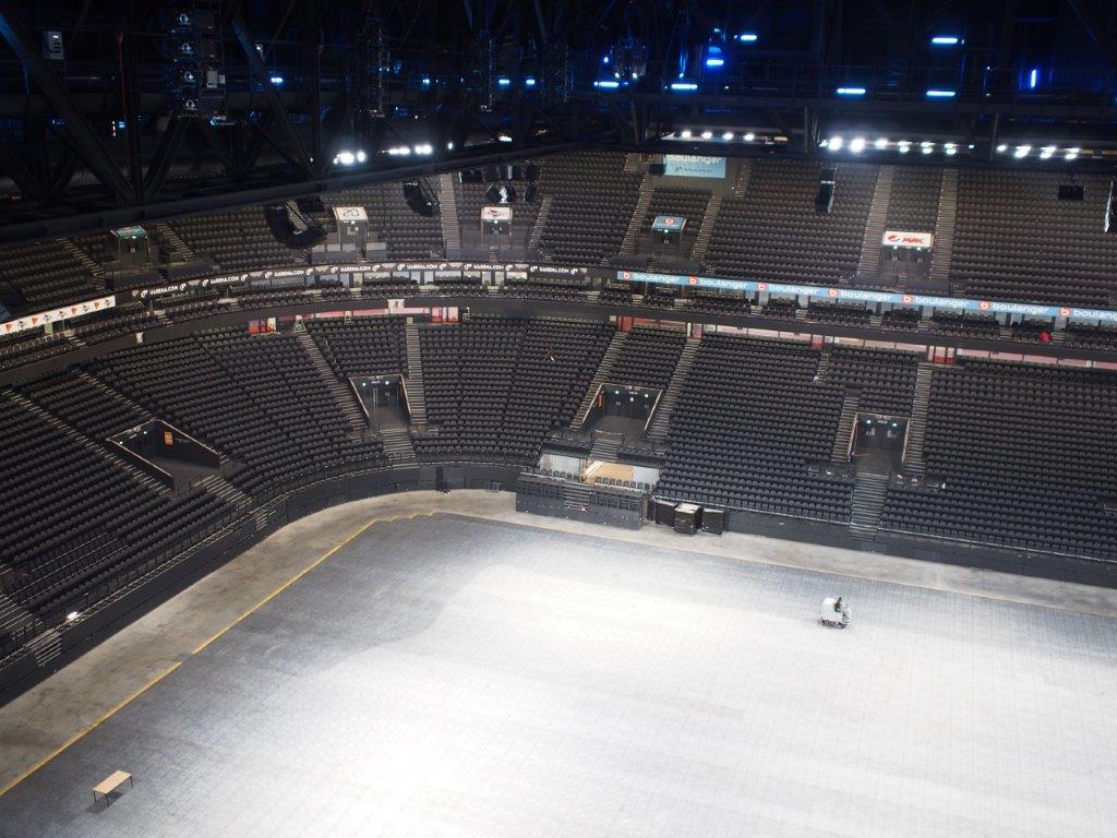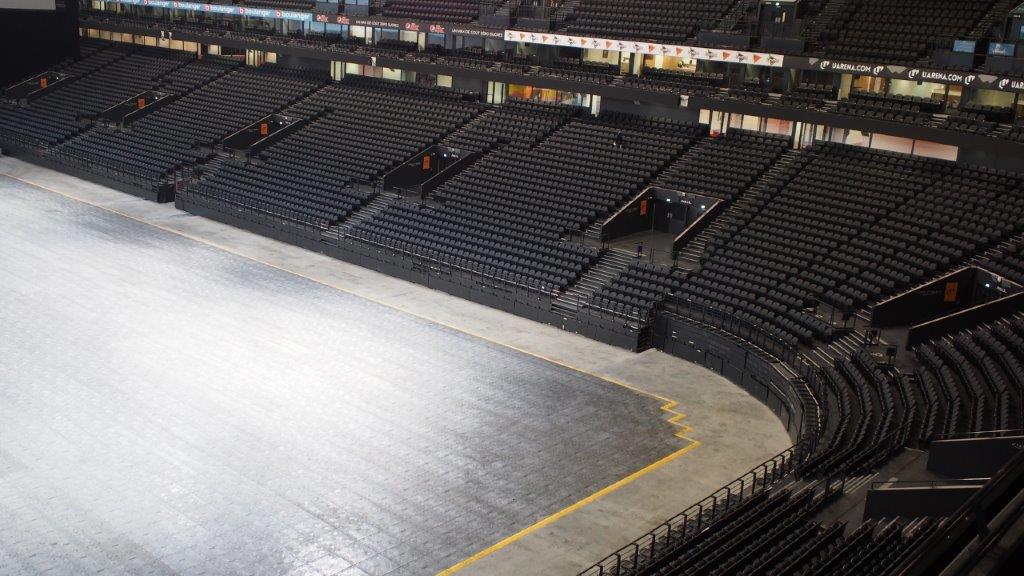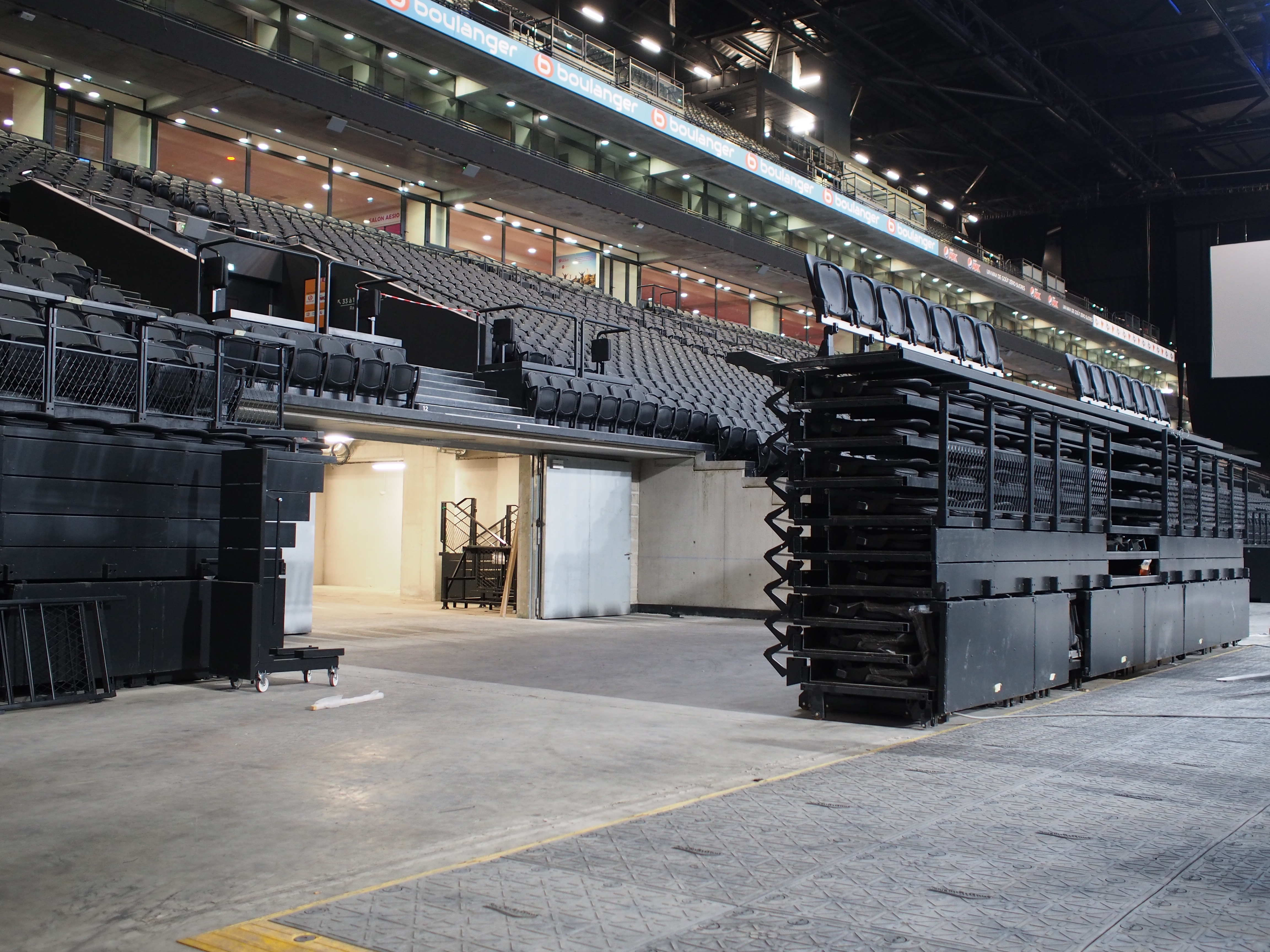 Les tribunes elles-mêmes sont entièrement modulaires et rétractables pour faciliter un large éventail de configurations. Elles comprennent des tribunes d'angle complexes qui ont été fabriquées sur mesure pour s'ouvrir et se fermer dans cet espace inhabituel. Pour les grands événements sportifs, les tribunes peuvent être totalement ouvertes, pour les matchs se déroulant sur un terrain en herbe, elles peuvent être partiellement ouvertes et pour les concerts avec des zones réservées aux spectateurs debout, elles peuvent être fermées. Pour les événements avec un public plus restreint, certaines tribunes peuvent être ouvertes tandis que d'autres restent fermées, en utilisant un rideau de séparation pour modifier l'agencement selon les besoins. Lorsque les sections ne sont pas utilisées, elles peuvent être retirées pour être stockées facilement à l'aide d'un chariot élévateur à fourche et de chariots.
