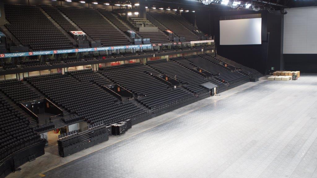 Master Industrie a été chargé de fournir des tribunes modulaires et télescopiques pour améliorer la flexibilité des sièges. Les tribunes se trouvent dans la partie inférieure de l'arena et peuvent accueillir 4 200 spectateurs. Elles ont dû être spécialement conçues et construites sur mesure pour répondre à la disposition inhabituelle en forme de U, avec des plates-formes d'angle trapézoïdales. Les sièges eux-mêmes ont dû être achetés à BlueCube Seating pour répondre aux dimensions particulières spécifiées par l'architecte.
